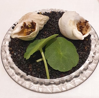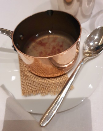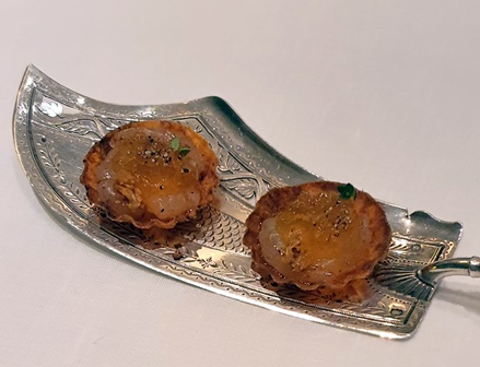 Le Champagne Pierre Péters Cuvée les Chétillons 2013 va accompagner les canapés et les prémices, dont voici la description : Canapés : consommé Eugène, consommé de perdreau torréfié, infusion de sarriette, essence de bois de genévrier, whisky tourbé, échalote et fenouil sués, poivre Voatsiperifery / bouillon ‘chemin d’automne’ eau de châtaigne torréfiée. Prémices : vinaigrette ‘berlugane’, endocarpe de pamplemousse, mandarine et citron vert, gingembre, miel de fleur, infusion de marjolaine, mandarine Mikan, citron vert et orange sanguine pressée, huile de Bouteillan, huile d’olive infusée à la mandarine, poivre de Sancho.