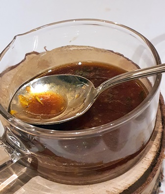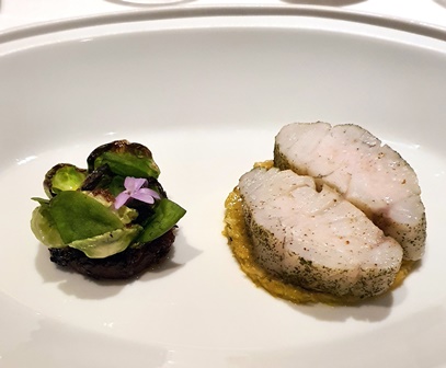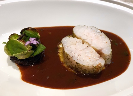 Chaque intitulé de plat a le mot ‘POUR’, ce qui semblerait indiquer que le plat est fait pour la sauce et non l’inverse. D’ailleurs Arnaud Donckele nous recommande à tout instant de commencer par goûter la sauce. Voici le ‘POUR’ du sandre : Soupe ‘songe de vigne’ : fumet de sandre au vin rouge pinot noir, cognac, pastis, peau de bergamote, beurre d’écrevisse, cardamome noire, marjolaine, vinaigre de vieux vin, safran, infusion de bergamote, bois de fenouil, citronnelle et gingembre, huile d’olive bergamote, baie de genièvre.