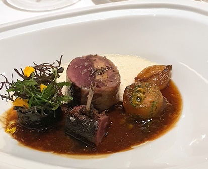 On est dans la sophistication absolue avec un résultat d’une gourmandise idéale. Je fais servir par Emmanuel le compétent sommelier le vin blanc et le vin rouge pour qu’on puisse choisir lequel accompagnera les plats, au gré de chacun.
