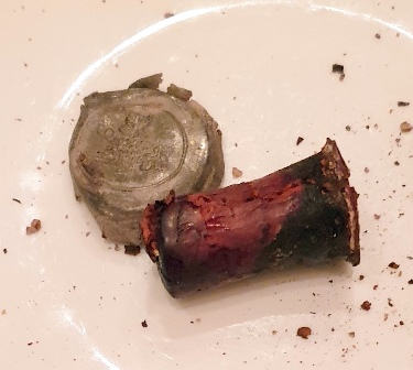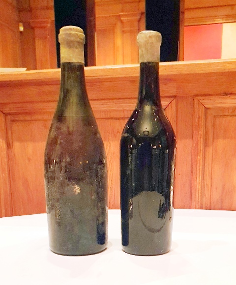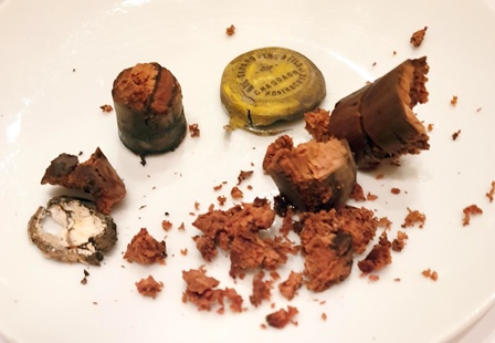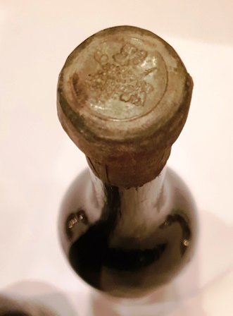J’arrive peu avant 19 heures au restaurant Taillevent et j’ouvre les deux bouteilles. La bouteille du vin blanc est très ancienne et le bouchon se brise en mille morceaux pour une raison simple, il y a une surépaisseur de verre au milieu du goulot qui interdit de lever le bouchon sans le briser. Le parfum du vin est une bombe de fragrances intenses. Quelle puissance et quelle richesse ! Tiendra-t-il ce niveau brillant, nous verrons. Contrairement au bouchon du vin blanc, le bouchon du vin rouge vient entier, conique, le bas du bouchon étant plus étroit, épousant la forme du verre. Le bouchon est tout petit, comme c’était le cas pour les bouteilles de la première moitié du 19ème siècle. L’odeur est discrète mais semble raffinée. Je pense à un vin délicat de Bordeaux. J’avais imaginé bien sûr la possibilité que mes bouteilles se montrent décevantes et nous aurions pris des vins de la carte des vins très vaste du restaurant, mais il apparaît que cela pourrait ne pas être le cas.