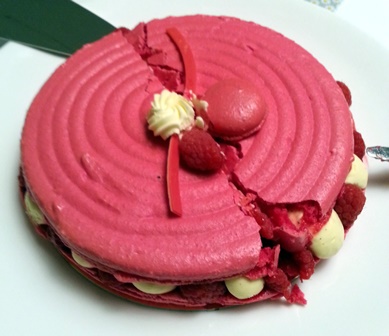En allant acheter du pain à la maison Sarroche, mon regard fut attiré par un dessert qui ressemble à s’y méprendre à l’Ispahan, le dessert fétiche de Pierre Hermé. Je l’ai donc acheté et nous le goûtons maintenant. Même si les fondations de la maison Hermé ne vont pas trembler, ce dessert est particulièrement brillant, le macaron et la framboise étant d’une fraîcheur et d’une légèreté à signaler. Les quelques gouttes restantes du Salon 1996 ont mis un point final à ce simple mais charmant dîner.