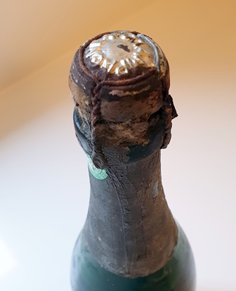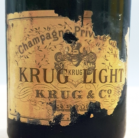 Pour l’apéritif, j’ai choisi en cave par un pur hasard une bouteille extrêmement rare d’un Champagne Krug Private Cuvée dont le surtitre est KRUG LIGHT. Cette bouteille doit être des années 40. Le niveau est bas, la couleur est assez grise, vue à travers le verre de la bouteille, et le bouchon semble avoir souffert. Par précaution je l’ouvre une heure avant le dîner et le fil de fer du muselet est si vieux qu’en cherchant à dévisser l’oreille pour élargir le treillis du muselet, l’acier se casse en petits morceaux. N’ayant plus rien à tourner, je suis obligé d’élargir comme je peux le bas du muselet et pendant que je bouge le métal, le bouchon bouge aussi. Ce qui fait que je lève ensemble le muselet et le bouchon qui ne résiste pas. La première odeur est rebutante, un peu viandeuse.