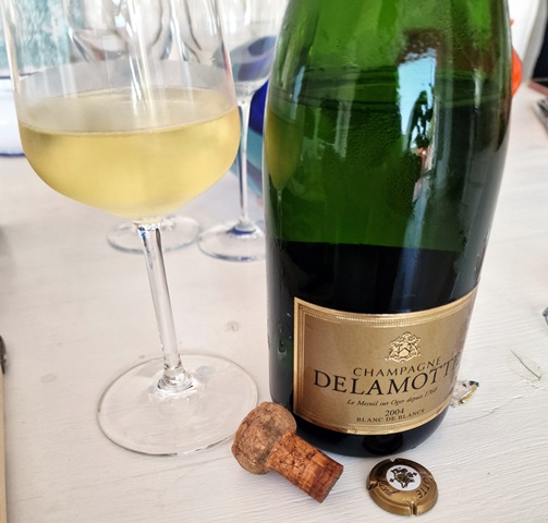 J’ouvre un Champagne Delamotte 2004 qui fait un très beau pschitt. La bulle est très active et le champagne est clair, signe de jeunesse. On n’est pas au niveau de Salon bien sûr mais ce champagne a atteint une belle maturité et se montre très agréable.