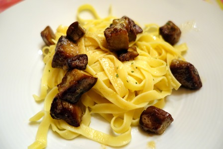 Le plat est de tagliatelles aux dés de foie gras poêlés. Tout vin conviendrait à ce plat gourmand et le champagne de Couche s’en sort bien. Quand il est arrivé à son terme, je sers le reste de la veille du Champagne Krug 1982. Et j’ai bien fait de servir les champagnes dans cet ordre car le Krug pris en premier aurait nui au plaisir du Couche. Nous avons raison d’aimer le champagne de Buxeuil, mais Krug se positionne à un niveau supérieur, avec de magnifiques. Il a une belle vivacité, et la palette de ses complexités que l’on est au sommet de la Champagne.
