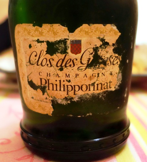 Ce Krug est floral, romantique mais vif, un exemple de champagne. Pour les fromages, j’ouvre un Champagne Philipponnat Clos des Goisses 1983. A l’ouverture, au nez et en bouche c’est le café qui envahit les narines et le palais. C’est très curieux, plaisant et cela ne dure pas. Le champagne est cinglant, vif, de belle bulle. Il est à l’aise, vineux, et sait se montrer généreux. Il se place bien après le Krug.