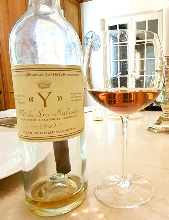 Je prélève pour l’un des cinq dîners un Y d’Yquem 1962. Le niveau est beau, la couleur est magnifique, mais le bouchon est descendu partiellement dans le liquide. Heureusement, tous les autres vins sont conformes à ce que j’attendais.