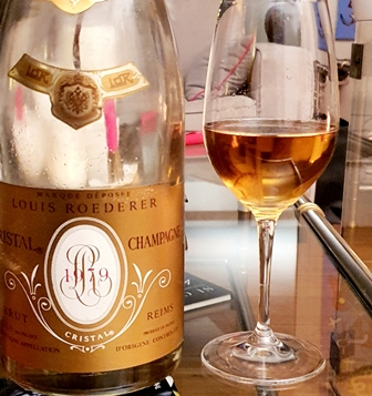 Du fait du confinement, j’ai élaboré un projet de cinq repas à faire lors de déjeuners ou de dîners, pour six convives seulement, puisque c’est une limite évoquée par le gouvernement. Ces repas ont été construits sur papier, en consultant l’inventaire de cave. Il faut vérifier l’état des vins. Un magnum de Champagne Cristal Roederer 1979 est rangé dans son carton. En le saisissant, il me semble trop léger. J’ouvre le carton et je vois que la moitié du contenu s’est évaporée. Et cela doit être ancien, car le carton est marqué mais sec. Sur le carton une étiquette indique que j’ai acheté cette bouteille en 2001 en salle de ventes. Le vin est un peu plus foncé que ce que j’attendrais mais semble convenable. Il est exclu que je le mette dans un dîner officiel.