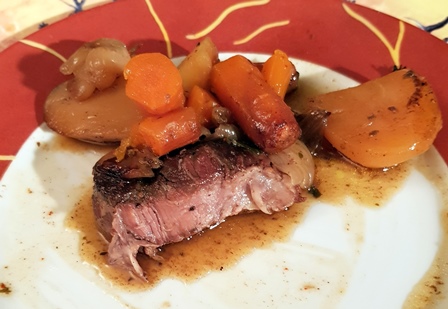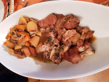 Le sujet principal du repas, c’est des pieds de porc cuits pendant 4h30 avec des légumes variés. Le plat est copieux et on se régale. Quel bonheur ! Je croyais que mon apport serait beaucoup plus puissant que le vin de mon ami. Erreur ! Le Cheval des Andes Mendoza Argentine 2004 que j’avais situé à l’aveugle en Espagne est une bombe gustative malgré les « seulement » 13,5° annoncés sur l’étiquette. Ce vin, fruit d’un assemblage de malbec et de cabernet sauvignon, est puissant comme un vin moderne mais a un finale mentholé qui signe un grand vin. J’étais toujours sceptique devant le Cheval des Andes que j’ai toujours bu jeune dans des présentations professionnelles de vins et ce soir devant ce vin de quatorze ans, je suis conquis.