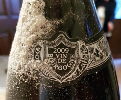 Hugues a gardé des bouteilles poussiéreuses du vin local. Certaines sont vides ou quasi vides. Nous en prenons deux, une à mi-hauteur sans grand espoir et une de beau niveau et nous prenons un magnum du Rully 2009.