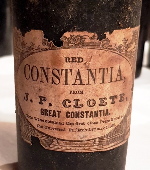 Le dessert sera au chocolat et à la crème de marron. Il faut un vin de dessert, ce qui est un appel à aller voir la collection de vins anciens liquoreux d’Hugues. Je suis sidéré de trouver des bouteilles qui ont la même façon de poser la cire sur les bouchons, les mêmes petites étiquettes carrées et jaunies et les mêmes étiquettes de cahiers d’écoliers que les bouteilles que je possède des mêmes vins. Mais il y en a d’autres que je n’ai pas. C’est de cas du Constantia d’Afrique du Sud dont l’étiquette dit qu’il a obtenu une médaille d’or à une exposition universelle de 1855. De quand datent ces vins, c’est difficile à dire mais ce pourrait être 1861 car Hugues me montre le menu d’un repas tenu le 29 octobre 1934 qui comportait des vins de cette collection dont un Constantia 1861. Partons sur cette idée.