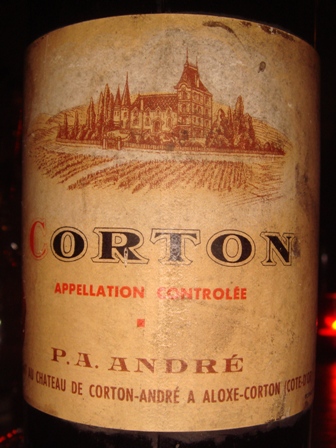 Corton blanc P.A. André, négociant au Château de Corton-André à Aloxe-Corton 1949 (la bouteille est de forme bordelaise, et la petite étiquette a une devise charmante)