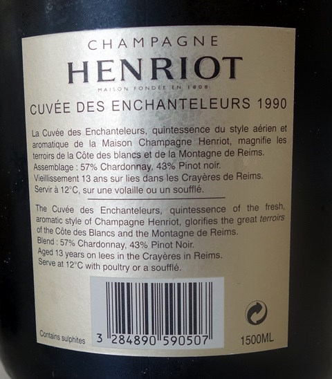Nous invitons des amis à dîner. L’apéritif se fera avec des petites baguettes fourrées aux tomates confites, aux olives et recouvertes de filets de fromage coulant. Il y a aussi de la poutargue. Dès que je porte mes lèvres au Champagne Henriot Cuvées des Enchanteleurs magnum 1990, c’est un rayon de soleil qui éclaire mon cerveau. Ce champagne est la perfection du champagne simple, facile à boire, et correspond à la définition du bon champagne. De plus, il profite incroyablement de la générosité du millésime 1990. Ce champagne n’est que du bonheur. Très équilibré et généreux, il est gourmand et de bonne mâche. On n’est pas du tout dans le registre des champagnes complexes ou typés, on est dans celui des champagnes de joie.