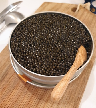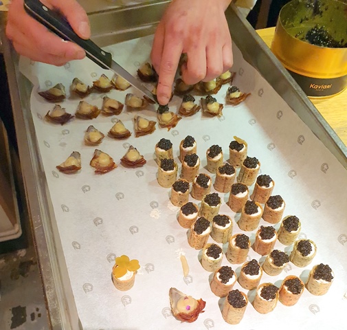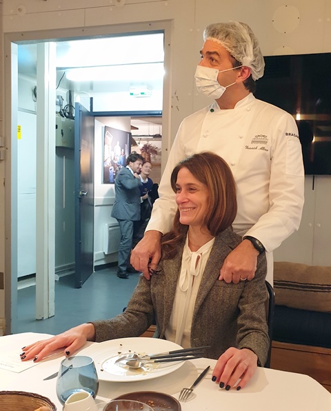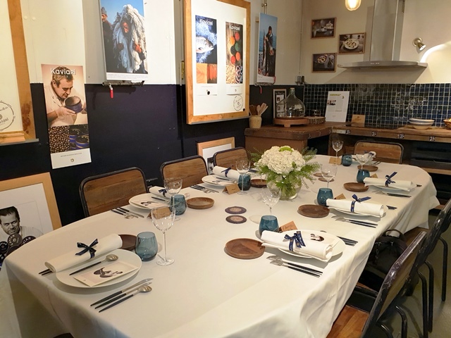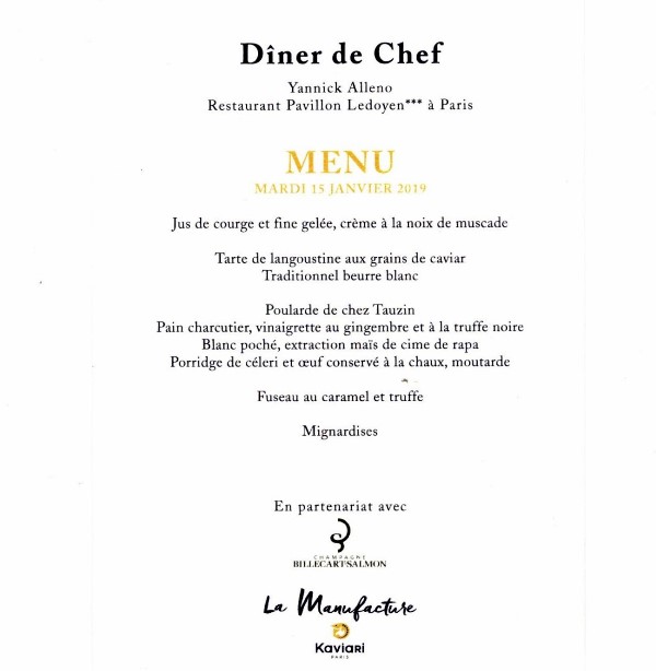 Karin Nebot, qui gère la Manufacture Kaviari a créé le concept « dîner de chef », prêtant les locaux de la manufacture à un chef qui fait un menu où le caviar joue un rôle. Des chefs prestigieux et étoilés se sont succédé et ce soir le chef qui officie est Yannick Alléno qui a trois étoiles gagnées à l’hôtel Meurice et s’exprimant pleinement au Pavillon Ledoyen.