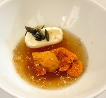 Ce repas est au niveau le plus haut de la gastronomie, mais le cadeau le plus beau de cette soirée est que Yannick Alléno est venu s’asseoir à notre table pendant un temps très long et nous a émerveillés par ses considérations sur l’histoire de la cuisine, sur les sauces qui sont un élément essentiel de la cuisine et sur l’extraction sur laquelle il a abondamment travaillé. L’entendre expliquer le sens de sa cuisine est un plaisir qui surpasse le plaisir de son repas même s’il est d’un niveau exceptionnel. Yannick est resté longtemps et a bavardé avec tout le monde. Son ouverture d’esprit est rare. Ce fut sans doute le plus beau repas auquel j’ai assisté à la manufacture Kaviari et un moment précieux. Vive les « dîners de chefs » Kaviari.