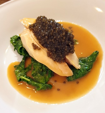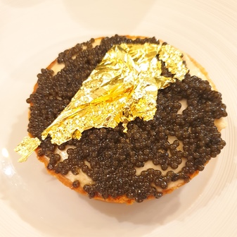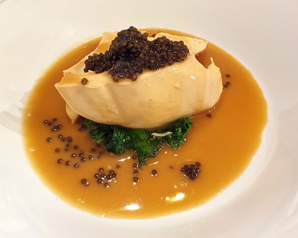 La gelée est divine et j’ai rarement goûté une aussi belle mise en valeur de l’oursin. Ce plat est d’une subtilité inouïe et plante le décor : on sait qu’on est au sommet de l’excellence. La tarte est sacrément copieuse et le caviar est généreusement dispersé sur la tarte à la feuille d’or. Cette tarte est d’une légèreté rare. Le pain charcutier est très original et gourmand, le porridge de céleri fait voyager dans des saveurs peu fréquentes et la chair de la poularde est d’une tendreté irréelle. La sauce est superbe et magnifie la volaille. Elle est dotée d’une belle dose de caviar osciètre. Ce plat est d’un niveau exceptionnel.