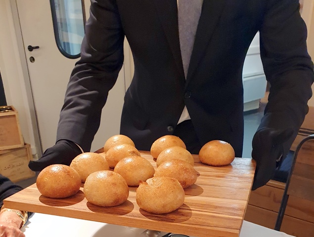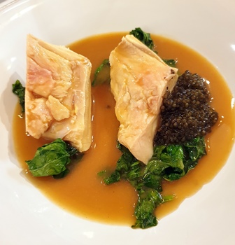 Nous prenons l’apéritif debout avec un Champagne Billecart-Salmon Brut qui sera le champagne qui accompagnera toute la soirée, servi en magnum puis en bouteille. Ce champagne très agréable et sans aspérité est le compagnon parfait des différentes cuisines de ces événements. A l’apéritif le caviar est présenté sous trois formes d’amuse-bouche. La préparation avec de l’artichaut met moins en valeur le caviar. Celle au hareng est divine.