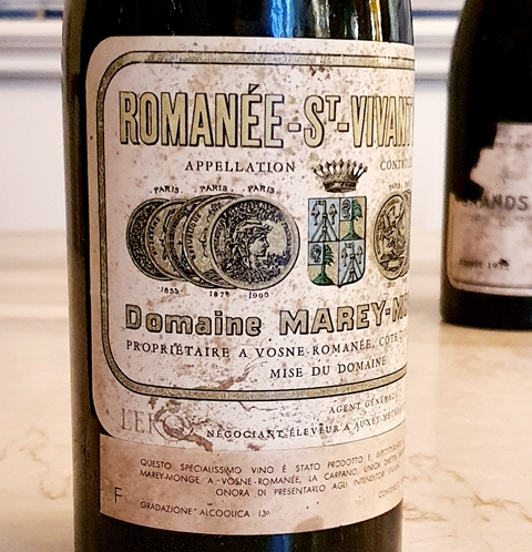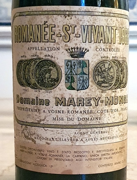 A 16 heures j’ouvre la Romanée Saint-Vivant Marey-Monge, Leroy négociant 1966 au niveau un peu bas mais acceptable. Le bouchon vient entier et l’odeur qui émane de la bouteille est affreuse, putride, et je pense que cette odeur a toutes les chances de persister, ce qui rendrait le vin imbuvable. Ma femme qui sent le vin aussi est beaucoup moins critique et estime que le vin va éliminer ces mauvaises odeurs. Je ne partage pas son avis d’autant que cinq minutes plus tard même si le parfum est moins atroce, il est encore fortement marqué par des odeurs de sueur, de serpillière presque sèche et de poussière. La règle que je me suis fixée est de toujours laisser une chance aux vins, mais je vais voir en cave un candidat potentiel pour remplacer ce vin. Pourquoi ai-je indiqué au début de ce récit « proche du domaine » ? Parce qu’en 1966 Geneviève Marey-Monge dernière héritière de la famille décide de mettre en fermage auprès du domaine de la Romanée-Conti la parcelle qu’elle possède. Le vin de 1966 a-t-il été élevé et vinifié sous l’ancienne ou la nouvelle direction, je ne le sais pas.