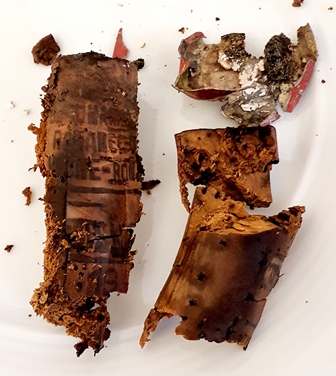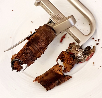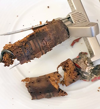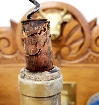 Le Grands-Echézeaux Domaine de la Romanée Conti 1952 a un niveau assez bas, comme c’est souvent le cas des vins de ce domaine sur cette période. Je plante mon tirebouchon limonadier et malgré mes efforts je n’arrive pas à le soulever tant il est durci, comprimé dans le goulot. Je constate une fois de plus le phénomène curieux qui veut que des bouchons extrêmement serrés dans le goulot laissent quand même passer du liquide qui s’évapore, alors que d’autres, moins solidement enfermés dans le goulot, n’entraînent aucune évaporation. J’enlève le limonadier inopérant et je prends le tirebouchon Durand qui combine un tirebouchon et un bilame. Et contrairement à ce qui devrait normalement se passer, le bouchon se déchire en lambeaux que je ramasse avec les outils dont je dispose. Mes efforts ont une récompense car le parfum de ce vin est divin. Riche de fruits rouges il promet le meilleur, car ce parfum est droit, précis et riche.