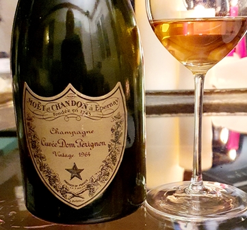 Ma fille nous rejoint et je sers à chacun le Champagne Dom Pérignon 1964. Il a une couleur très proche de celle du Lanson, avec un ambré qui lui aussi a des petites notes de couleur rose, mais c’est peut-être dû à l’éclairage et au feu de cheminée. Ce champagne est marqué par une assez forte amertume qui limite le plaisir. Le Lanson n’en apparaît que plus brillant encore. Sur le foie gras, le Lanson est impérial et l’accord est superbe.