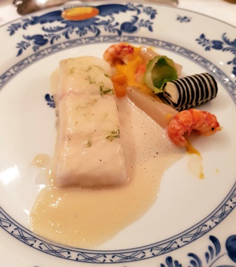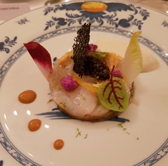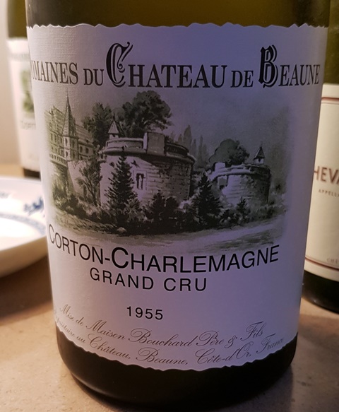 Le Corton-Charlemagne Grand Cru Bouchard Père & Fils magnum 1955 est servi avant le plat. De ce fait, il paraît assez frêle après l’imposant vin de la Cabotte et je trouve que de suivre le 2002 n’est pas un service à lui rendre. Mais le vin va s’épanouir sur le plat de Saint-Jacques, idéal pour le vin. Les ingrédients du plat sont un peu trop nombreux pour assurer une totale cohérence mais le 1955 impose son raffinement et ses complexités nobles. C’est un très grand vin d’équilibre et de subtilité tout en sachant s’affirmer. Autant de présence pour un vin de 62 ans étonne mes voisins de tables qui sont généralement peu familiers de vins de cet âge.