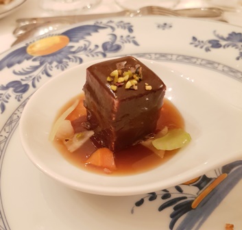 Le plat qui ressemble à un lièvre à la royale est une vraie réussite. Il est cohérent, puissant et convient parfaitement au Volnay Caillerets Premier Cru Bouchard Père & Fils 1934. Ce qui est curieux c’est que l’étiquette ainsi que le menu n’indiquent pas « ancienne cuvée Carnot » alors que le bouchon que Philippe Prost me montre, bouchon d’origine, porte clairement cette mention. Le vin a une couleur d’un beau rouge franc sans l’ombre d’une trace tuilée. Le vin est riche, puissant et il faut ça pour le plat, et il est d’un équilibre parfait, percutant, poivré, riche avec de beaux fruits rouges et noirs. Son finale est brillant.