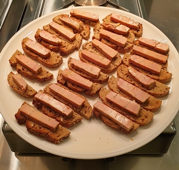 L’apéritif commence par des petites tranches de foie gras mi- cuit posées sur du pain aux céréales qui accompagnent le Champagne Lanson Red Label 1964 qui se présente dans la belle bouteille en forme de quille. Le bouchon est venu en deux morceaux car la torsion l’a cisaillé. Le champagne est d’un bel or acajou clair, la bulle est active. Ce champagne est une explosion de fruits exotiques. Il projette ses complexités comme en un feu d’artifice. C’est un champagne joyeux, dynamique et impressionnant par son fruit généreux et ces complexités innombrables. Une poutargue bien grasse n’apporte pas la continuité gustative qu’offre le foie gras.
