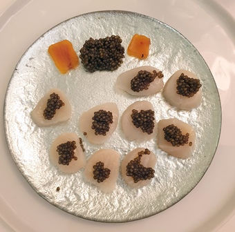 La cuisine fondée essentiellement sur le produit majeur du plat est idéale pour les vins. Caviar, coquilles, pigeons, Wagyu, saint-nectaire, stilton, mis en valeur par eux-mêmes ou par la préparation et la cuisson ont été de la plus belle qualité. Le plat qui m’a le plus ému par sa délicatesse est celui des coquilles juste poêlées. Tout a été réuni pour que nous entrions dans une nouvelle année et une nouvelle décennie dans une atmosphère chaleureuse, amicale, de belle gastronomie.