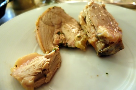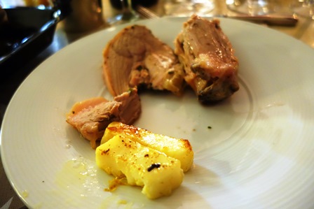 J’ai ouvert trois vins de Guigal pour que nous nous amusions à les comparer. Le risotto à la truffe est délicieux. Il eût appelé un vin blanc aussi attendons-nous le porcelet pour profiter des vins. La Côte Rôtie La Mouline Guigal 1986 est d’une rare complexité et d’une belle sérénité. Elle a une mâche accomplie de première grandeur.