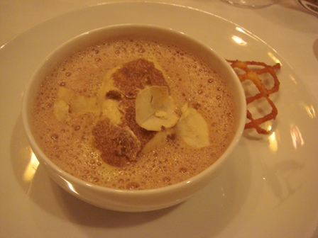 Cappuccino de châtaignes à la truffe d’Alba, bouillon mousseux de poule faisane, truffe blanche râpée