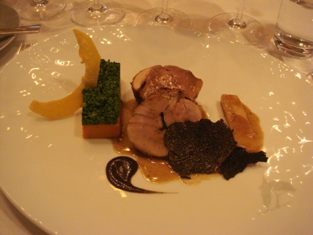 Le chapon de deux saisons généreusement truffé et rôti, potimarron écrasé, semoule de brocoli, céleri au jus clair
