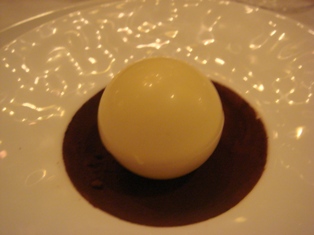 Marrons glacés et perles de mangoustan, parfait vanillé, gelée de rhum, chocolat croustillant