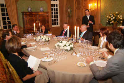 We go to the castle. We are nine. Four couples and myself. We drink a Dom Pérignon 1985 which was designed to clear the mouth from the invading persistent charm of Yquem 2001. It is served with some cakes that I could not negotiate to avoid. These cakes shorten this elegant champagne which is a champagne of fight : it requires a complicated food to fight with it for the pleasure of our palate. Obviously a great champagne.
