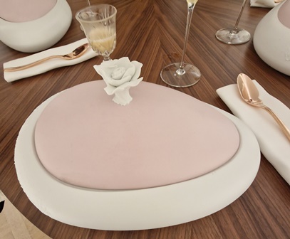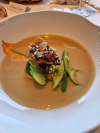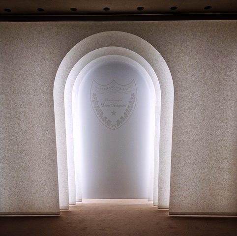 Lorène, notre charmante hôtesse, toute souriante, nous explique que notre repas se fera en plusieurs étapes en des lieux différents. Chaque table suivra le même parcours, mais successivement. Je n’ai que la version anglaise du menu qui est inspiré par le Champagne Dom Pérignon Vintage 2004 P2 : oyster, champagne, fennel for broth « songe anisé » / leerfissh, spider crab, broccoli for vinaigrette « ambroise » / sea potato for broth « ode à l’iode » / Zitone pasta Saint-Tropez inspiration / poultry, caviar, trompette courgette for velouté « champenois » / twilight over the star, grapefruit, rose, champagne / rose financier.