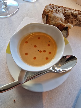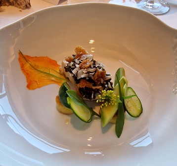 Après les deux premiers plats nous allons en cuisine et ça me fait plaisir que les cuisiniers affairés me saluent par mon nom. Nous prenons place dans la salle du chef, juste en face de la ruche travailleuse, et Arnaud Donckele nous apporte une sauce. Il nous dit que pour ses plats il faut toujours commencer par la sauce, car le plat est au service de la sauce et non l’inverse. Il nous dit que la sauce est composée de quatre ou cinq madeleines de Proust de son enfance qu’il a voulu associer. Il nous les décrit.