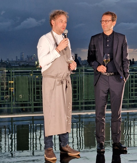 Après ce passage émouvant par la salle privée du chef en cuisine, nous traversons des couloirs habillés de tentures blanches au sigle de Dom Pérignon, qui conduisent au fumoir où nous sommes accueillis par Vincent Chaperon, le maître de chais de Dom Pérignon, qui a réalisé avec Richard Geoffroy le millésime 2004. Vincent nous explique la philosophie de Dom Pérignon et la vision des plénitudes et souvent on croit entendre des intonations de Richard. En pleine possession de son sujet et assuré, Vincent nous passionne.
