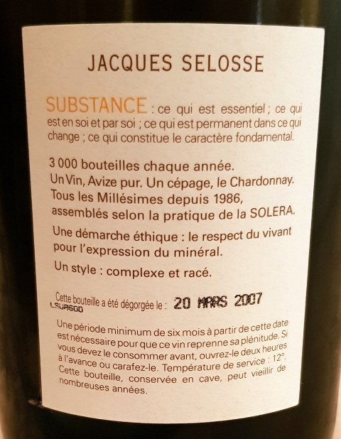 Le Champagne Substance de Selosse dégorgé le 20 mars 2007, une nouvelle fois lors d’un équinoxe, a un bouchon qui libère une belle énergie. La couleur du champagne est plutôt foncée, d’un acajou orangé. Le champagne est noble. Il est à la fois généreux et fruité, de beaux fruits juteux. Et ‘en même temps’, comme dirait notre Président, il est cinglant, vif et racé. Sur du saucisson et des tranches de chorizo enroulées sur des gressins, il est actif.