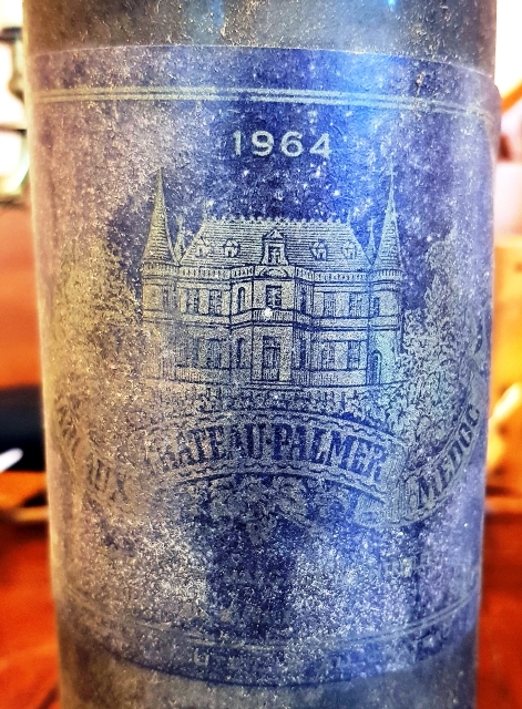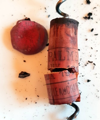 Ma fille vient reprendre ses enfants le lendemain et va déjeuner avec nous. J’ai ouvert un vin rouge près de deux heures avant le repas. Il s’agit d’un Château Palmer, Margaux 1964. Son niveau, entre mi- épaule et haute épaule est acceptable. Sous la capsule, le haut du bouchon est recouvert d’une poussière noire. Lorsque je veux piquer le tirebouchon le bouchon descend un peu aussi faut-il faire très attention pour que le tirebouchon ait une prise suffisante. Le bouchon est d’une très belle qualité. L’odeur à l’ouverture est belle et prometteuse. La couleur est d’un rouge rubis sans l’ombre d’une trace de tuilé. Le vin est jeune.