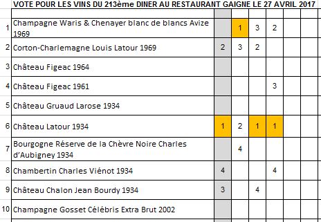 Le vote du consensus serait : 1 – Château Latour 1934, 2 – Champagne Waris & Chenayer blanc de blancs Avize 1969, 3 – Corton-Charlemagne Louis Latour 1969, 4 – Château Chalon Jean Bourdy 1934 , 5 – Chambertin Charles Viénot 1934, 6 – Château Figeac 1961.