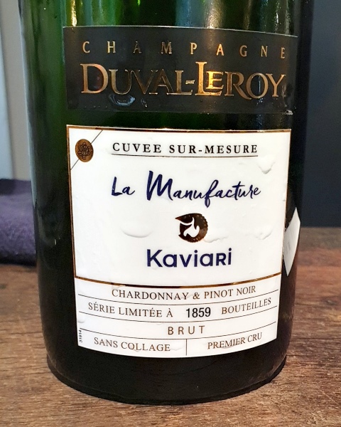 On est accueilli par un verre de Champagne Duval-Leroy « La Manufacture Kaviari », cuvée sur mesure d’une série limitée à 1859 bouteilles, avec des vins de premiers crus de chardonnay et pinot noir. Ce champagne un peu strict convient bien aux produits de la manufacture et va s’épanouir face aux mets.