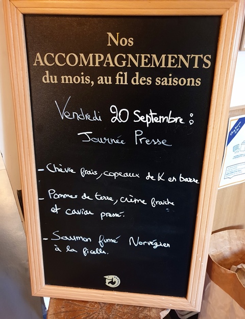 On me propose un chèvre frais avec des copeaux de caviar pressé sec en barre. Je suggère que l’épaisseur du chèvre soit réduite de moitié pour que l’accord soit pertinent, car le chèvre prendrait le dessus. Un accord beaucoup plus intéressant est un pressé de caviar qui est servi sur une petite pomme de terre revêtue de crème fraîche. L’accord est idéal et le caviar pressé est inspiré.