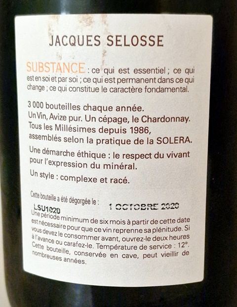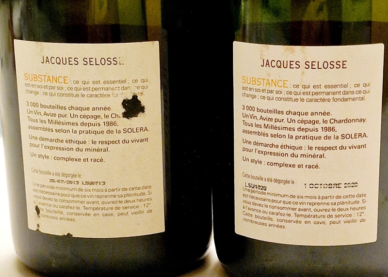 Ma femme avait prévu pour le repas une brouillade d’œufs à la truffe et un butternut. La brouillade me fait lancer une idée : que diriez-vous si j’allais chercher en cave un Substance dégorgé en 2013, pour que nous comparions les deux ? Chacun avait en tête nos promesses de ne pas boire et l’hésitation fut longue. Mais l’envie l’emporta.
