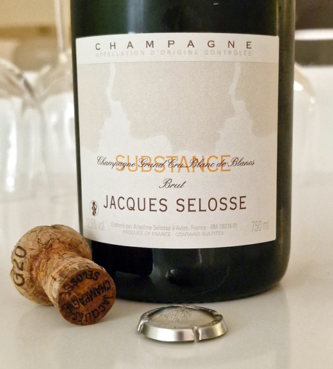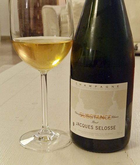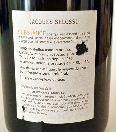 Suffisamment refroidi je sers le Champagne Substance Jacques Selosse dégorgé en juillet 2013. Sa couleur est à peine plus ambrée et sa bulle est active, le champagne ayant fait un pschitt significatif à l’ouverture.