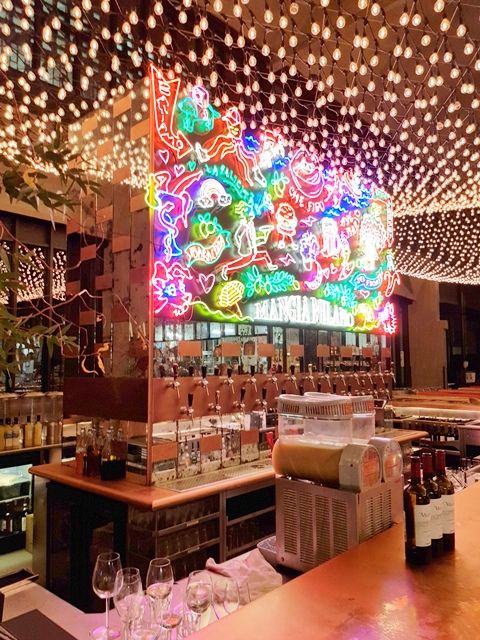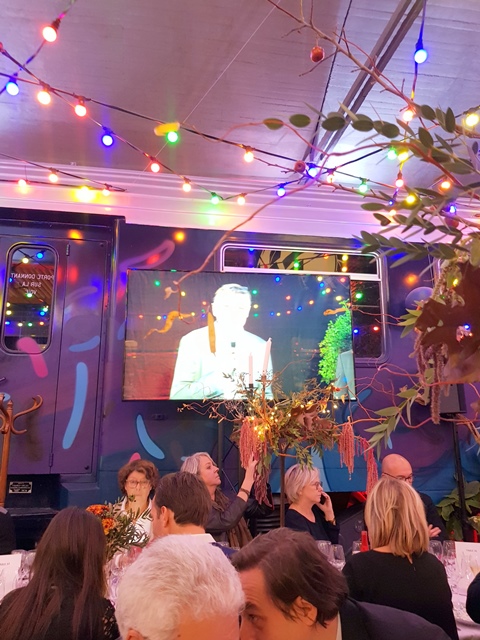 Dans des versions précédentes il y avait un long apéritif debout qui permettait de parler avec tout le monde. Du fait du nombre, on nous demande de nous asseoir à la table qui nous est assignée ce qui fait que l’on parle surtout avec le petit cercle de sa table. Le repas d’inspiration italienne ne me semble pas du niveau de ce que pourraient imaginer les talentueux chefs présents, mais il est difficile de faire mieux pour tant de monde : charcuteries italiennes, mozzarella, burrata, foccacia, finedor piment d’espelette bridor (recette de Lenôtre professionnel) / risotto radicchio, petit pain caractère et petit pain céréales et graines bridor / tiramisu, gelato, mousse au chocolat.