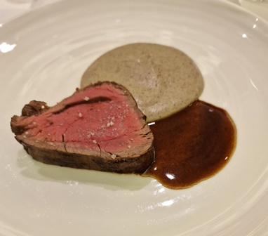 Le Châteauneuf-du-Pape Château de Mont-Redon 1955 est fascinant car il a des accents de sel qui ressemblent à ceux des vins de la Romanée Conti. Brillant vin du Rhône qui est très au-dessus de ce que j’attendais, il forme avec le bœuf délicieux, de race limousine, provenant de la ferme de Garance, propriété de la famille de Guillaume, un accord parfait sublimé par la purée truffée. Le vin riche est subtil et l’accord est l’un des meilleurs du repas.