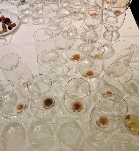 Les odeurs les plus puissantes sont celles du Château Chalon 1959 et de l’Yquem 1957. Une très plaisante fragrance est celle du Bienvenues Bâtard Montrachet Bouchard Père & Fils 1960. Pour beaucoup de vins la première odeur est marquée par une odeur de serpillière ou de linge mouillé, mais aucune mauvaise odeur ne me semble devoir subsister. Je suis donc confiant dans la réussite de tous les vins. La plus grande interrogation avant d’ouvrir était Palmer 1937, car ce millésime subtil est beaucoup moins régulier que le solide 1934. Je me souviens que le restaurant Laurent avait un stock important de vins de Bordeaux de 1937 et Philippe Bourguignon le directeur m’en proposait à bas prix car il savait qu’une bouteille sur deux pouvait avoir des problèmes.