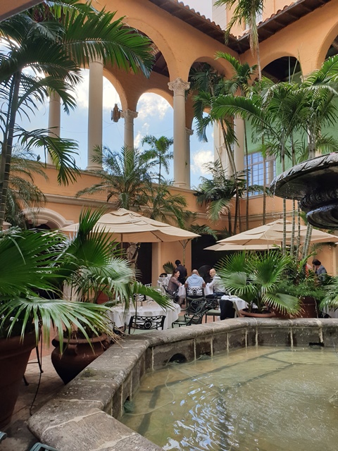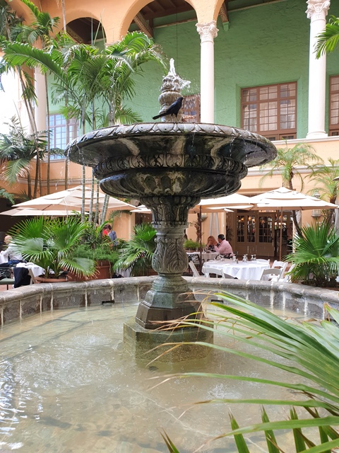 Le dimanche à l’hôtel Biltmore, le rendez-vous à ne pas manquer, c’est le brunch au champagne. Au rez-de-chaussée de l’immeuble principal il y a un immense patio. Trois côtés du carré font partie de l’immeuble et le quatrième, ouvert vers le golf, est formé par des colonnades. Au centre du patio il y a une très grande fontaine. Dans les restaurants qui jouxtent le patio, des stands sont installés et proposent une abondance de plats cuisinés. Voici ce que j’ai picoré : huîtres manquant un peu d’iode, caviar de qualité très moyenne, alors que ce qui suit ne mérite aucune critique. Pinces d’araignées de mer, saumon fumé, coquilles Saint-Jacques, crabes décortiqués, crevettes, terrine de poisson, œuf Benedict et quiche lorraine. Pour les desserts, mes yeux ont été plus gros que mon ventre car tout m’est apparu si beau que j’ai succombé. Tarte aux pommes, tiramisu, pithiviers, crème brûlée, fruits confits, chocolat-noisette, et d’autres saveurs encore. Il est évident que devant tant de buffets brillants, on succombe en oubliant toutes réserves.