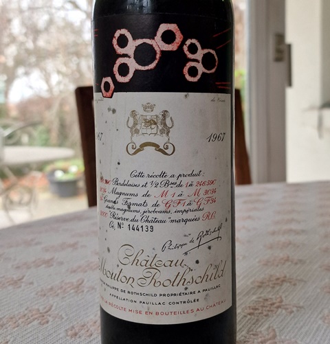 Ma femme qui cuisinait depuis deux jours et avait fait cuire à feu doux un gigot d’agneau dans un bouillon de légumes le sert maintenant. La chair est fondante. Mes filles s’émerveillent devant le Château Mouton-Rothschild 1967 qui a un parfum précis et noble et une bouche d’une grande distinction. C’est un grand vin qui justifie le classement de premier grand cru classé qu’il n’obtiendra que six ans après ce millésime. Le vin est grand, raffiné, noble, riche et profond. Mes filles l’adorent.