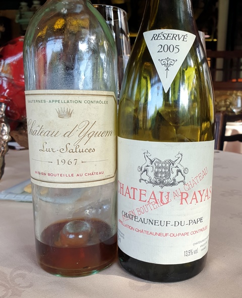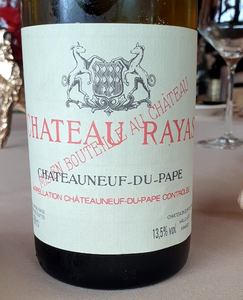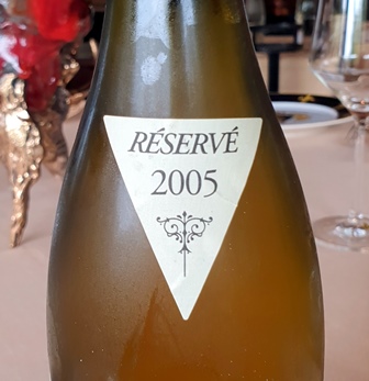 Servi en même temps, le Château Rayas Châteauneuf-du-Pape blanc 2005 est d’une belle couleur très claire, de blé d’été. Son parfum est noble et droit. En bouche, l’attaque est puissante et le vin est très légèrement fumé. En bouche au contraire, c’est la fluidité que le rend presque aérien malgré ses 13,5°. Le finale est noble. Pour l’amuse-bouche c’est lui qui paradoxalement est le plus approprié. Mais ensuite l’Yquem du fait de sa noblesse et de sa force de conviction se montre plus adapté.
