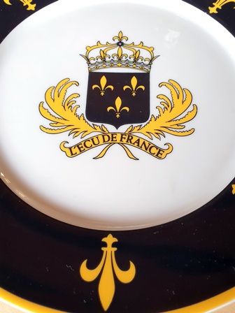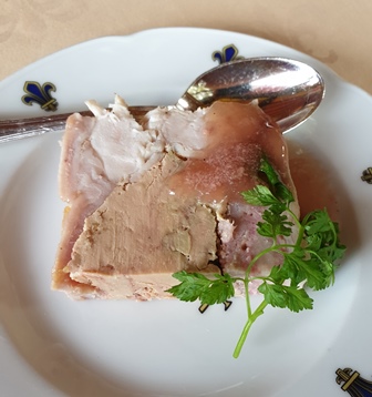 L’Ecu de France est un ancien relais de Poste et la décoration est d’un charme certain par le caractère désuet, très 19ème siècle de tous les objets amassés. En haut du toit, accrochée à la gueule d’une gargouille, pend une enseigne métallique qui indique « pense à ta panse et fais dépense ». Nous allons faire bien volontiers nôtre ce dicton. Dans la grande salle du restaurant il y a aussi une collection d’assiettes où sont inscrites des pensées de la même veine.