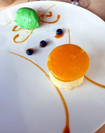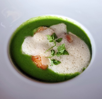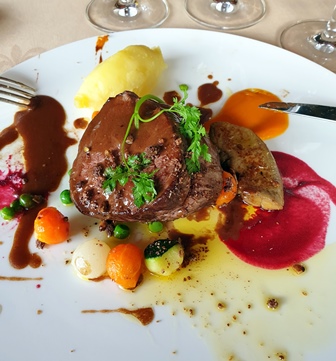 Le chef Peter Delaboss que je vais saluer en cuisine m’annonce les plats qu’il a prévus pour notre déjeuner. Le programme sera : pressé de lapin et foie gras / cannelloni de saumon et langoustines, mariné à l’huile fumée et gingembre confit / velouté de févette, Saint-Jacques rôties, émulsion au Cantal / filet de bœuf cacaoyer et foie gras poêlé / cheesecake au citron, glace basilic.